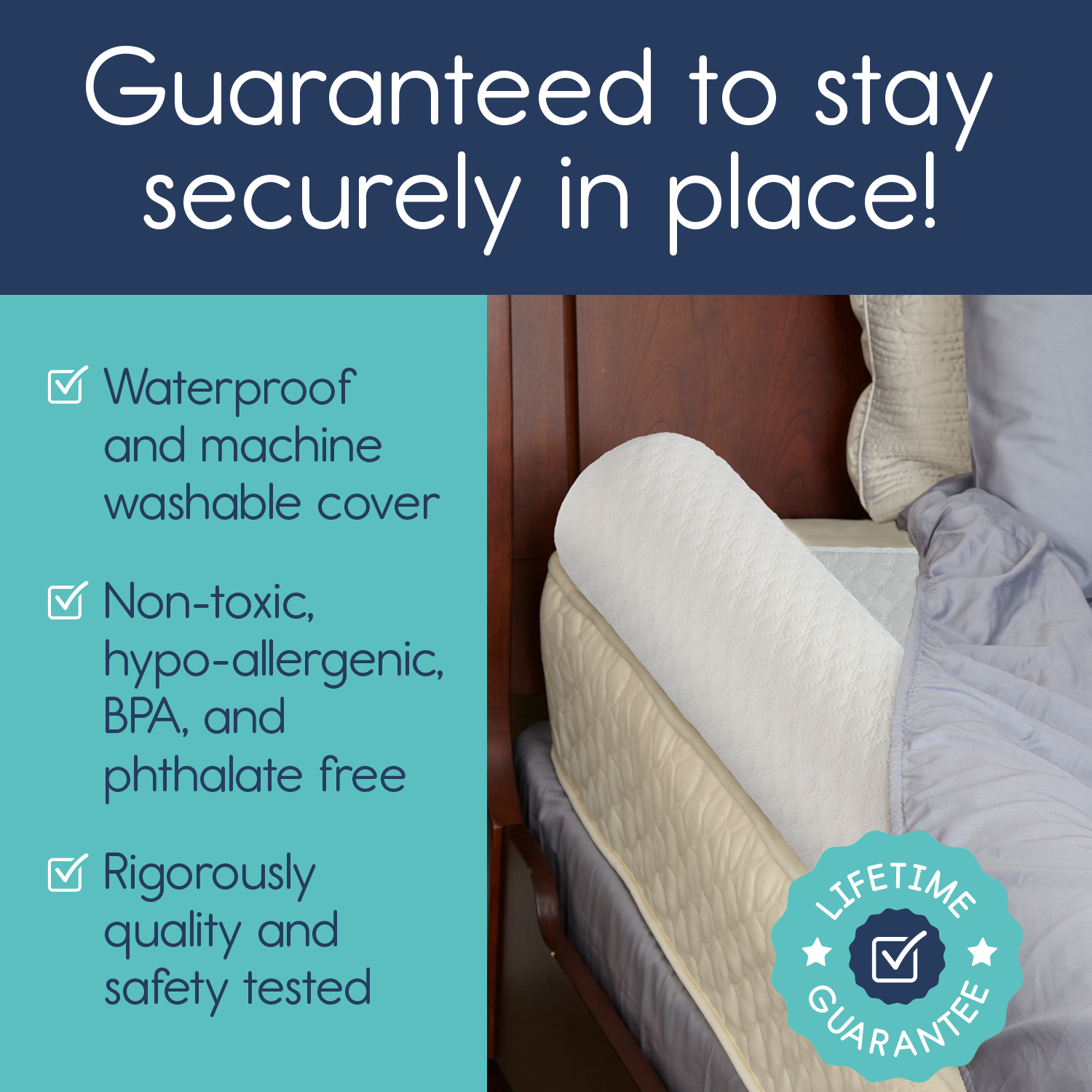 Installs in seconds under fitted sheets (toddler, twin, double, queen and king)
