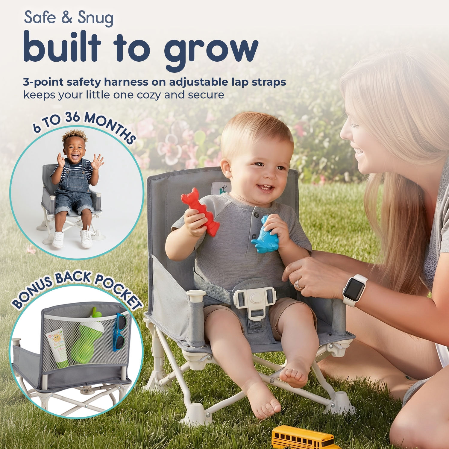 OmniBoost keeps even the squirmiest babies and toddlers from 6 months to 3 years fully secured and comfortable in their portable booster seat. When your little one grows older, simply remove the tray and boost him up to the kitchen table to eat with the grownups!